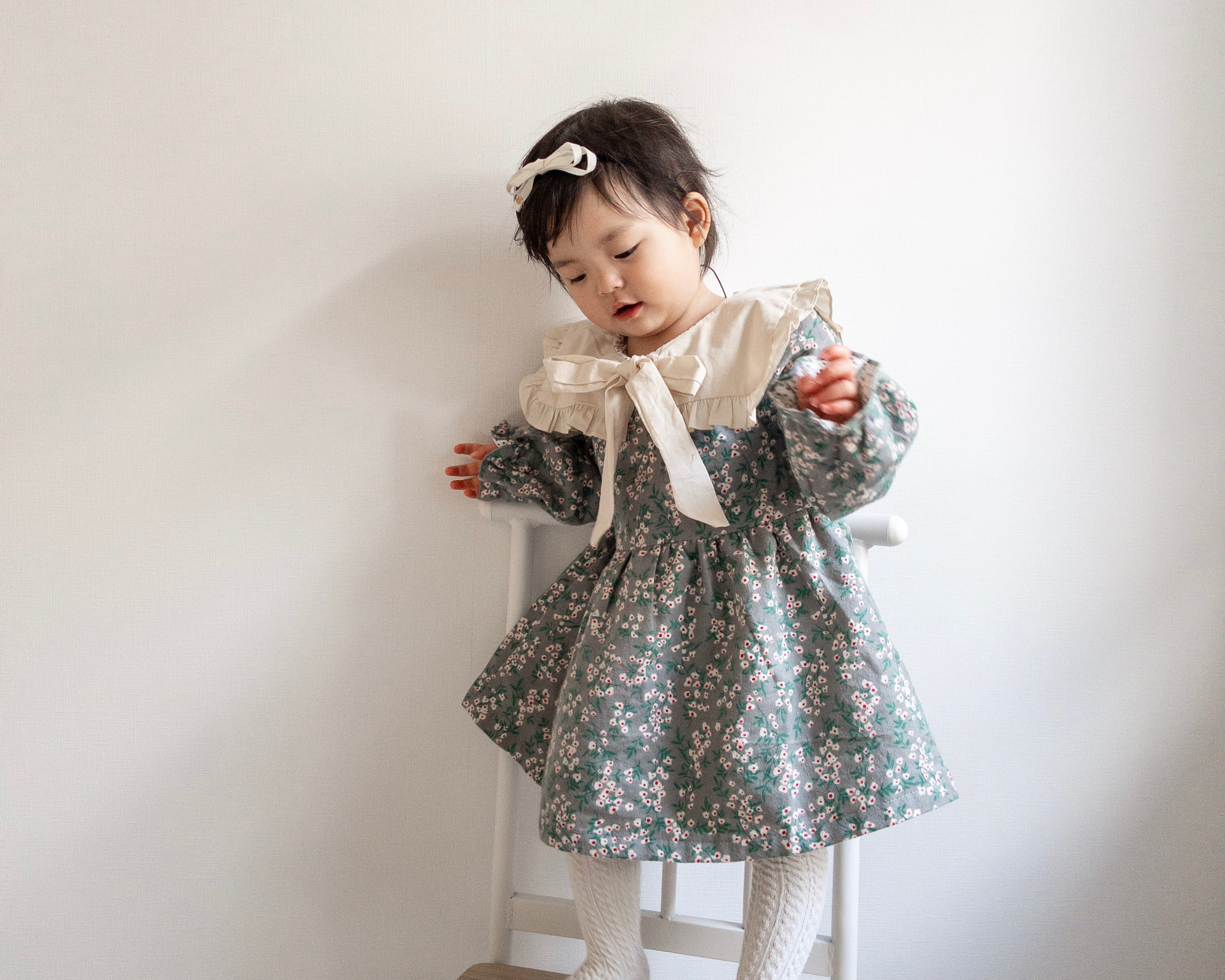 花柄のワンピースに、大きい襟の
